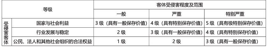 数据与档案分级参考的关键要素包括影响对象、影响程度、影响范围。(1)影响对象。档案法律关注对国家和社会的保存价值,数据分级也将国家安全、经济发展和社会公共利益相关的数据安全纳入最重点的考量,故涉及国家与社会利益的数据,应受最高级别的保护。其次,行业发展状况涉及各类生产部门效益与安全,符合分级规律,亦作为影响对象要素之一。最后,公民、法人和其他社会组织的合法权益也应为分级要素之参考。(2)影响范围与程度。目前行业标准有3级划分(《工业数据分类分级指南》)、4级划分(《金融数据安全数据安全分级指南》《基础电信企业数据分类分级方法》)两种形态,基本为一般损害、严重损害和特别严重损害三类。
